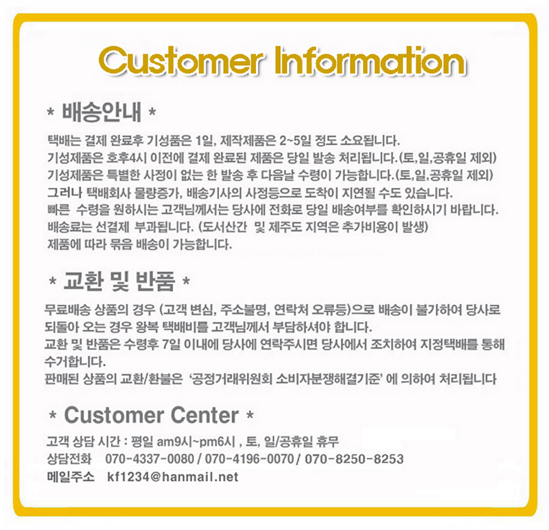 - 저단가 상품, 일부 특가 상품은 고객 변심에 의한 교환, 반품은 고객께서 배송비를 부담하셔야 합니다(제품의 하자,배송오류는 제외)